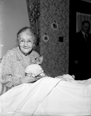 Mrs. T. J. Flake was honored with a dinner on her 84th birthday at the home of a daughter, Mrs. T. E. Boyd, 1721 Boyce. A woman sitting straight up in a bed with a blanket over her. She is elderly and smiling wearing a night gown. Published in Fort Worth Star-Telegram morning edition, October 23, 1950.