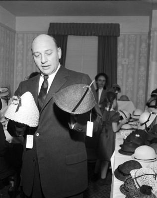 Richard Englander, designer and maker of hats for teen-agers, holds a couple of examples of his work at the National Fashion Exhibitors showing at Hotel Texas. A man wearing a suit. Published in Fort Worth Star-Telegram morning edition, October 23, 1950.