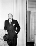 Adolphe Menjou in work clothes. A man wearing a suit standing facing forward. He has on white gloves and he has a hat in his hand. Published in Fort Worth Star-Telegram morning edition, October 23, 1950.