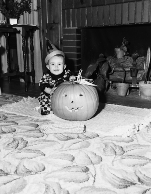 Image shows Karen Marie Barger, 6 month old, daughter of Mr. and Mrs. LeRoy Barger, 2823 Wingate. She is shown to be with a jack o'lantern in living room for Halloween. Published in the Fort Worth Star-Telegram evening edition, October 31, 1950.