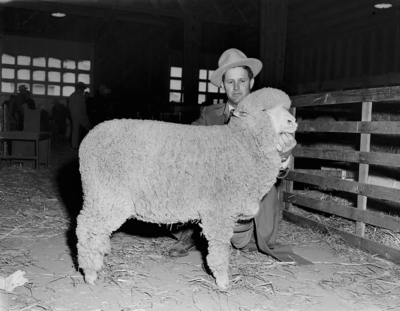 Here it is shown the champion Delaine Ewe of the Brownwood Livestock Show. George Johanson of Brady is holding it. He and H. C. Johanson owned the animal. Published in the Fort Worth Star-Telegram morning edition, January 23, 1950.
