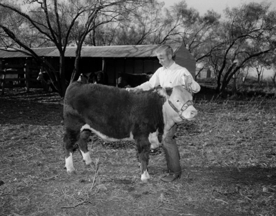Ira Hugh Harrington, Throckmorton High School FFA student, poses one of his good Hereford calves. Feeding is a major project for Ira and his classmates. Published in Fort Worth Star-Telegram morning edition December 3, 1950.