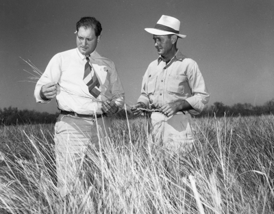 Elbert Steele, Throckmorton FFA instructor, left, and Marion Clark, SCS conservation aid, look over KR bluestem grass on the FFA's chapter's three-acre plot. Published in Fort Worth Star-Telegram morning edition December 3, 1950.