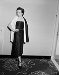 A black "summer satin" cotton worn with black and white stole is one of the advanced fashions being shown at the National Fashion Exhibitors market at Hotel Texas. Published in Fort Worth Star-Telegram evening edition, October 26, 1950.