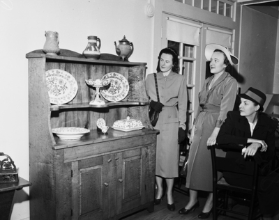 Image shows three women inspecting a maple cabinet and accessories. From left to right, Mrs. George Jaggers, Mrs. Roy Durst and Mrs. Robert Roark. They all find antiquing to be a fascinating hobby. Published in the Fort Worth Star-Telegram morning edition, October 29, 1950.