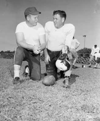 Lieutenant Bobby Dobbs, left, Carswell coach, talks things over with Sargeant W. M. (Pug) Few, former North Side star, who will be at center when Carswell Air Force Base (CAFB) football team entertains Keelser Field at Farrington Field. Published in Fort Worth Star-Telegram morning edition October 26, 1950.
