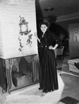 Image shows a unidentified woman wearing black dress posing beside a fire place in a living room. The image is part of fashion in the Society section. Published in the Fort Worth Star-Telegram morning edition , November 5, 1950.