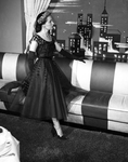 Image shows unidentified woman in black dress. She is posed on striped furniture gazing upon a city mural behind the furniture. The image is part of fashion in the Society section. Published in the Fort Worth Star-Telegram morning edition , November 5, 1950.