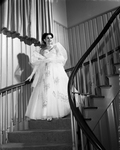 Image shows unidentified woman wearing white dress. She is walking down a spiral staircase. The image is part of fashion in the Society section. Published in the Fort Worth Star-Telegram morning edition , November 5, 1950.