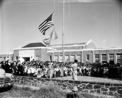 Grapevine school students gathered outside the building to watch Harry Fielder, sophomore son of Mr. and Mrs. D. H. Fielder, raise the American and United Nations flags. Members of the Grapevine Home Demonstration Club made the U. N. banner and presented it to the school. Published in Fort Worth Star-Telegram morning edition, October 25, 1950.