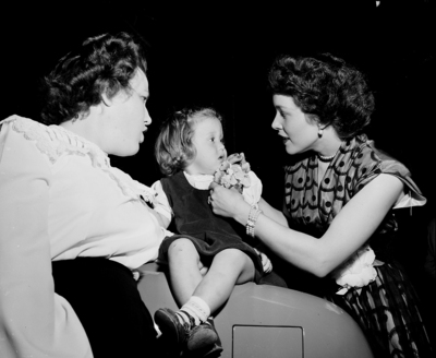 Gail Katherine Brown, 2 1/2-year-old daughter of Mrs. Woodrow N. Brown, 3033 Alta View, didn't want to be missed when orchids were passed out at the new Mercury showing. Miss Bobette Winkel of 5021 Pershing Obliged. Published in Fort Worth Star-Telegram morning edition, October 25, 1950.
