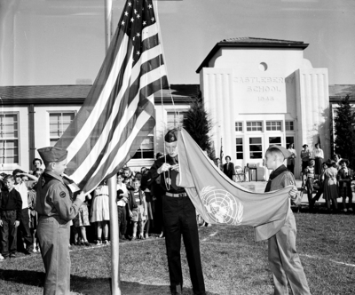 Boy Scouts from Castleberry Methodist Church's Troop 143 raised the U. N. flag at Castleberry School, before 1,500 students and teachers. Left to right are Richard Lee McKinney, 13, of 1200 Long; Rodger Wagner, 14, of 525 Bond, and Brooks Abbott, 12, of 106 Nursery Lane. Published in Fort Worth Star-Telegram evening edition, October 24, 1950.