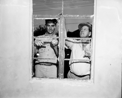 Herbert Carter, left, and George Layne, members of Glazers Local 1531 helped place window panes in steel casements at the Goodwill House. Published in Fort Worth Star-Telegram morning edition, October 25, 1950.