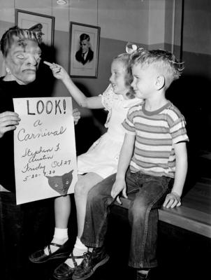 Sandra Forest of 305 Daggett and Doyle Shamburger of 1515 West Daggett, Stephen F. Austin Elementary School students, show no fear at all as Bobby Beard of 316 Lipscomb masquerades as Frankenstein to advertise the school's Halloween carnival to be held at the school. Published in Fort Worth Star-Telegram evening edition, October 26, 1950.