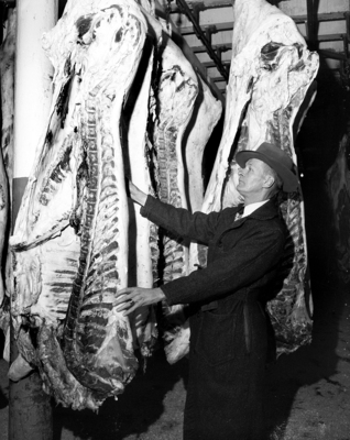 Image shows Ed Baelke, head of beef, lamb and veal department of the Fort Worth Swift and Company plant, looks over a beef carcass. He will use the carcass to demonstrate the various beef grades and classes. Published in the Fort Worth Star-Telegram morning edition, October 29, 1950.