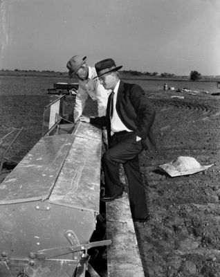 R. F. Rogers, left, and Frank Vollintine, new supervisor of the Dalworth Soil Conservation District, look over the workings of a new combination grain and fertilizer drill bought by the district for use by farmers at a small rental fee. Rogers, foreman of the Clarence Jones farm near Smithfield, seeded 40 acres of vetch and rye in the machine's first operation. Published in the Fort Worth Star-Telegram morning edition, November 12, 1950.