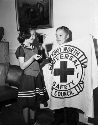 Judy Carol McDonald, 8, daughter of Mr. and Mrs. C. H. McDonald of 1248 E. Jessamine, and Bill Killian, 8, son of Mr. and Mrs. C. C. Killian of 1121 Marion, admire gold loving cup and master flag won by Morningside Elementary School students in safety contest. Published in Fort Worth Star-Telegram morning edition, October 26, 1950.