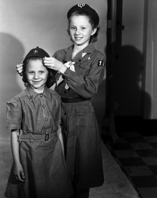 Image shows two Girl Scouts, Sandra Gayle Williams,11, right, placing a girl scout hat on her sister, Cub Scout Sharon Kaye Williams,7, in preparation for citywide "Scout Own" program in Texas Christian University (TCU) Stadium. The program will include 2000 Scouts, will open Girl Scout Week. Both Girl Scouts are shown to be in Girl Scout uniforms. The girl scouts are daughters of Mr. and Mrs. J. Berry Williams, 4423 Morris. Published in the Fort Worth Star-Telegram morning edition, October 29, 1950.