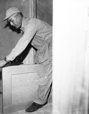 Image shows J. T. (Davey) Jones hanging doors at the Good Will House. He is shown to be leaning over at the construction site. Published in the Fort Worth Star-Telegram morning edition, October 29, 1950.