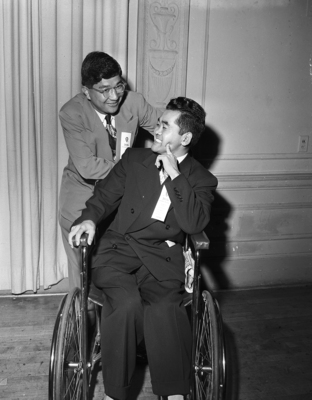 Image shows Mike Masaoka, left and Wilson Makabe, in wheelchair, arrived for the 36th division reunion. They both helped rescue the 36th Division's "Lost Battalion" in France during World War II. Published in the Fort Worth Star-Telegram morning edition, October 31, 1950.