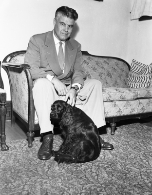 Image shows a bust shot of Hiram Broiles, he is chief of Civil Aviation Authority (CAA) chief of international district office in San Francisco, California. He is coordinating airlift that sent men, guns and equipment in the Korean War. Broiles is visiting his mother, Mrs. F. W. Broiles at 1506 Cooper. He is taking a two-week course of study in new air navigation aids at Will Rogers Field, Oklahoma City. He is shown seated on couch with unidentified dog. Published in the Fort Worth Star-Telegram morning edition, October 29, 1950.