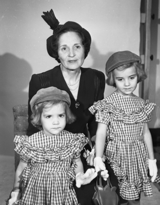 Image shows Mrs. M. O. Boring, center, with grand daughters, Julie Ann, left and Dixie Lynn Boring, right, daughters of Mr. and Mrs. M. O. Boring Jr, Odessa. They spent the weekend with their grandmother at 6307 Rosemont. Published in the Fort Worth Star-Telegram evening edition, October 31, 1950.
