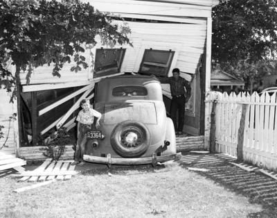 Image shows Jimmy Braziel, 9, left and his brother, Lynn Braziel, 16, standing outside beside the car that crashed into their home at 2701 Rosen Ave. The car is shown to be crashed into the side of their home. Published in the Fort Worth Star-Telegram evening edition, October 30, 1950.