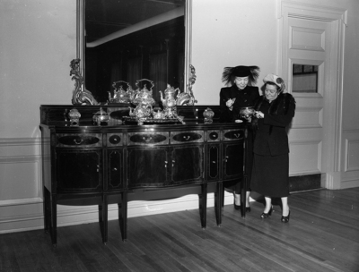 Mrs. L. H. Kassel, right, Round Table Club president, and Miss Elizabeth Miller with a Sheraton sideboard, the Round Table's memorial to Mrs. C. W. Connery.