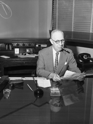 Image shows E. F. Murray, division rental and title supervisor of Standoline Oil and Gas Company. He is shown seated at desk smoking cigar. Published in the Fort Worth Star-Telegram morning edition, November 5, 1950.