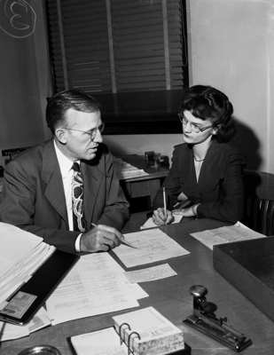 Image shows W. H. Jones, left, division order supervisor in rental and lease department at desk with secretary Judy Scott. He was transferred to Fort Worth division. Published in the Fort Worth Star-Telegram morning edition, November 5, 1950.