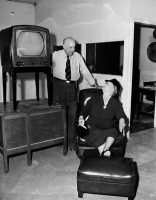 Image shows Mrs. J. Martin Clark sitting in chair, right with Mr. J. Martin Clark, left,standing beside Television set, received from coworkers for his retirement from Fort Worth Grain and Cotton Exchange. Published in the Fort Worth Star-Telegram morning edition, November 1, 1950.
