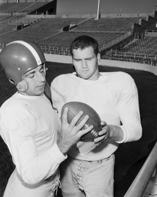 Intramural Star Floyd (Shorty) Sanders, left, and Full back Bobby Jack Floyd ponder over which one will quarterback Frogs against Baylor. Sanders, 5-8, 161, joined the squad this week. Published in Fort Worth Star-Telegram evening edition November 1, 1950.