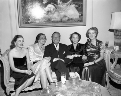 A man sitting in between four ladies at a party thrown by Amon Carter for Jeanette MacDonald and Gene Raymond.