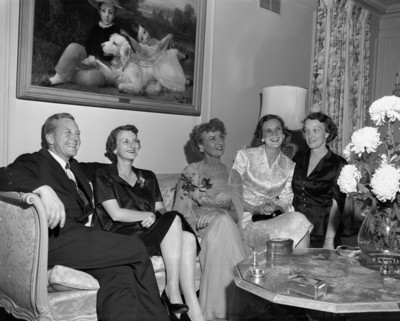 Gene Raymond , left, and Jeanette MacDonald, third from left, sitting on a couch with three other women.