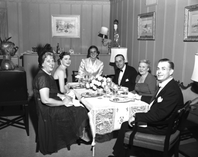 A group of people seated around a table at a party hosted by Amon Carter for Gene Raymond and Jeanette MacDonald.