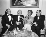 Jeanette MacDonald seated on a couch with three men at a party held in her honor.