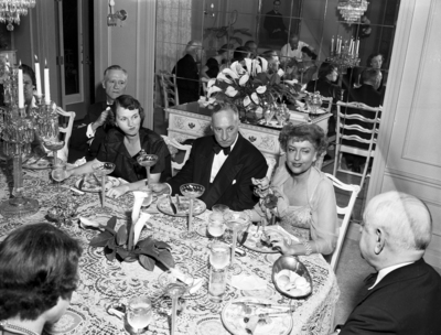 Amon Carter and Jeanetta MacDonald seated at a table with five others.