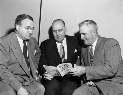 Image shows three men attending a dinner and reception in Hotel Texas preliminary to first annual Texas Livestock Round Up meeting. They are shown looking over a the program. From left to right, E. L. Dobbs, general manager of the Armour & Company plant ; True D. Morse, St. Louis, president of Doane Agricultural Service and Ed Hollenbeck of Sterling III, livestock feeder. Published in the Fort Worth Star-Telegram morning edition, November 2, 1950.