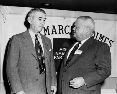 Image shows General Walter Krueger, left and Ed S. Stewart, Abilene, co chairman of 1951 Texas March of Dimes at polio conference. Published in the Fort Worth Star-Telegram evening edition, November 2, 1950.