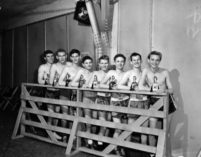 Regional Golden Gloves high school division champions proudly exhibiting their trophies are (left to right) Heavyweight Ed Crow, Light-heavy Ed Montgomery, Middleweight Roy Bostick, Welter Dexter Peacock, Lightweight Raymond Parr, Feather Garret Ramsey, Bantam Dewayne Neeley, Flyweight Buddy Moore. Published in the Fort Worth Star-Telegram morning edition, January 24, 1950.