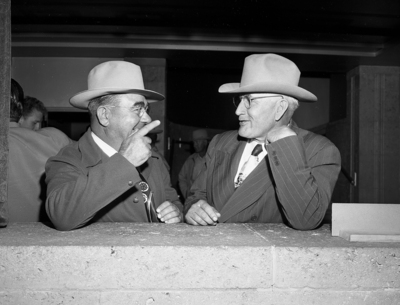 Image shows Joe Winston, left, Aledo Hereford breeder, discussing cattle with C. M. Caraway Sr., Deleon shorthorn breeder, at the Texas Livestock Round Up at Will Rogers Memorial Auditorium. Published in the Fort Worth Star-Telegram morning edition, November 3, 1950.