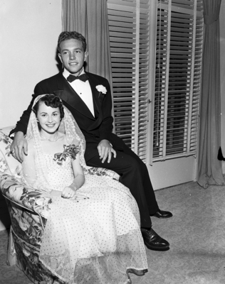 Image shows Mr. and Mrs. O. W. McCurdy Jr., at wedding reception at St. Andrew's Episcopal Church. They were honored by his parents, Mr. and Mrs. O. W. McCurdy at reception at the Women's Club. Published in the Fort Worth Star-Telegram morning edition, November 4, 1950.
