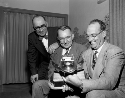 Image shows W. W. McClister, left, Krum Chrysler dealer, talking with H. B. Ransom, Fort Worth dealer, center and Nat Bush, Jacksboro dealer, right. They are at a dinner honoring Ransom at the Colonial Country Club. Published in the Fort Worth Star-Telegram morning edition, November 4, 1950.