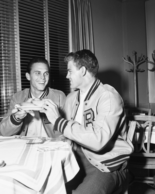 Larry Isbell, left, Baylor's star passer, tries a new maneuver with one of his favorite receivers, Harold Riley of Fort Worth, by passing the bread as the two dine at Hotel Texas. The Bears arrived in Fort Worth late in the afternoon. Published in Fort Worth Star-Telegram morning edition November 4, 1950.