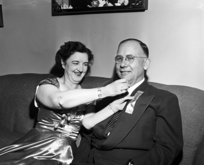 Image shows Mr. and Mrs. W. R. White. Mrs. W. R. White is shown pinning lapel on Dr. W. R. White, President of Baylor University. They are attending the Texas Christian University (TCU) and Baylor game. He is formerly a pastor of Broadway Baptist Church. Published in the Fort Worth Star-Telegram morning edition , November 4, 1950.