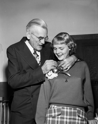 Image shows Frank Thweatt pinning corsage on Grapevine football sweetheart, Peggy Hemley. Frank Thweatt is from the class of 1915. They are at the Grapevine High School homecoming celebration with game with Lake Worth. Published in the Fort Worth Star-Telegram morning edition , November 4, 1950.