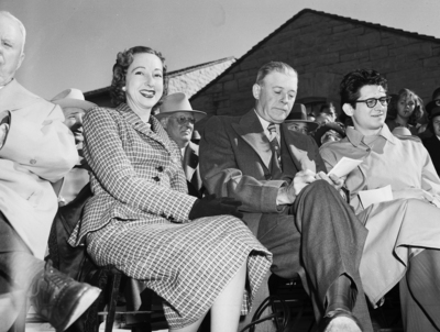 Two men and a woman seated at the unveiling of the Will Rogers Memorial Statue.