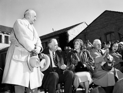 Amon Carter, left, looks beyond a crowd of seated people. Among the corwd of seated people is his wife, Mrs. Amon Carter.