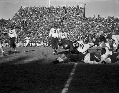 Texas Christian's Charles Rogers (81) sets his brakes and brings Baylor's James (Buddy) Parker to a halt on the Bears 31 in the third quarter of the game at TCU stadium. Other Frogs are Jim Amburg (31) and Bill Moorman (80). Published in Fort Worth Star-Telegram morning edition November 5, 1950.