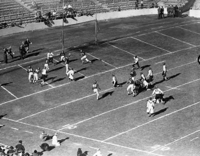 Frequently in the game with Baylor at Texas Christian University, TCU was repulsed at the goal line by various means, as the picture shows with an incomplete pass. Published in Fort Worth Star-Telegram evening edition November 6, 1950.